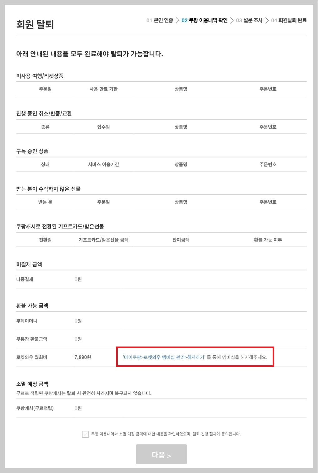 쿠팡 탈퇴를 진행하기 전, 반드시 로켓와우 멤버십이라면 멤버십 해지를 해야 합니다.
