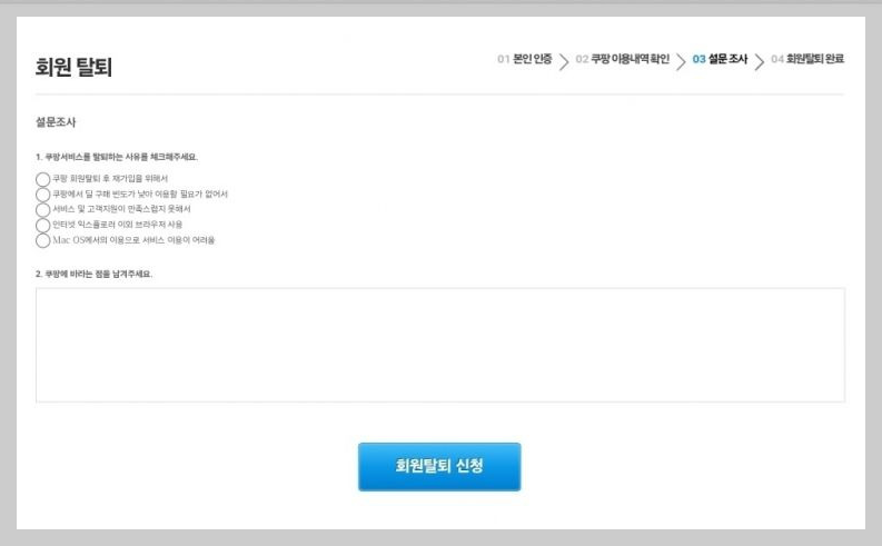 이후 본인 인증 → 이용내역 확인 → 설문조사 단계를 거치면 최종 탈퇴가 완료됩니다.
