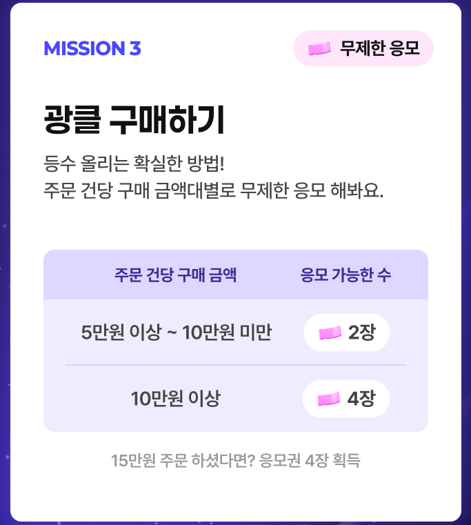• VIP 혜택: 응모권 최다 보유 상위 200명 → VIP 좌석 + 가수 사전 리허설 관람
