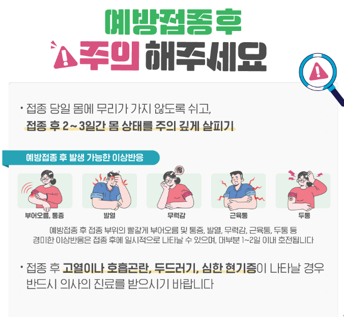 접종 후에는 20~30분 정도 의료기관에 머무르며 이상 반응 여부를 관찰하는 것이 좋습니다.
